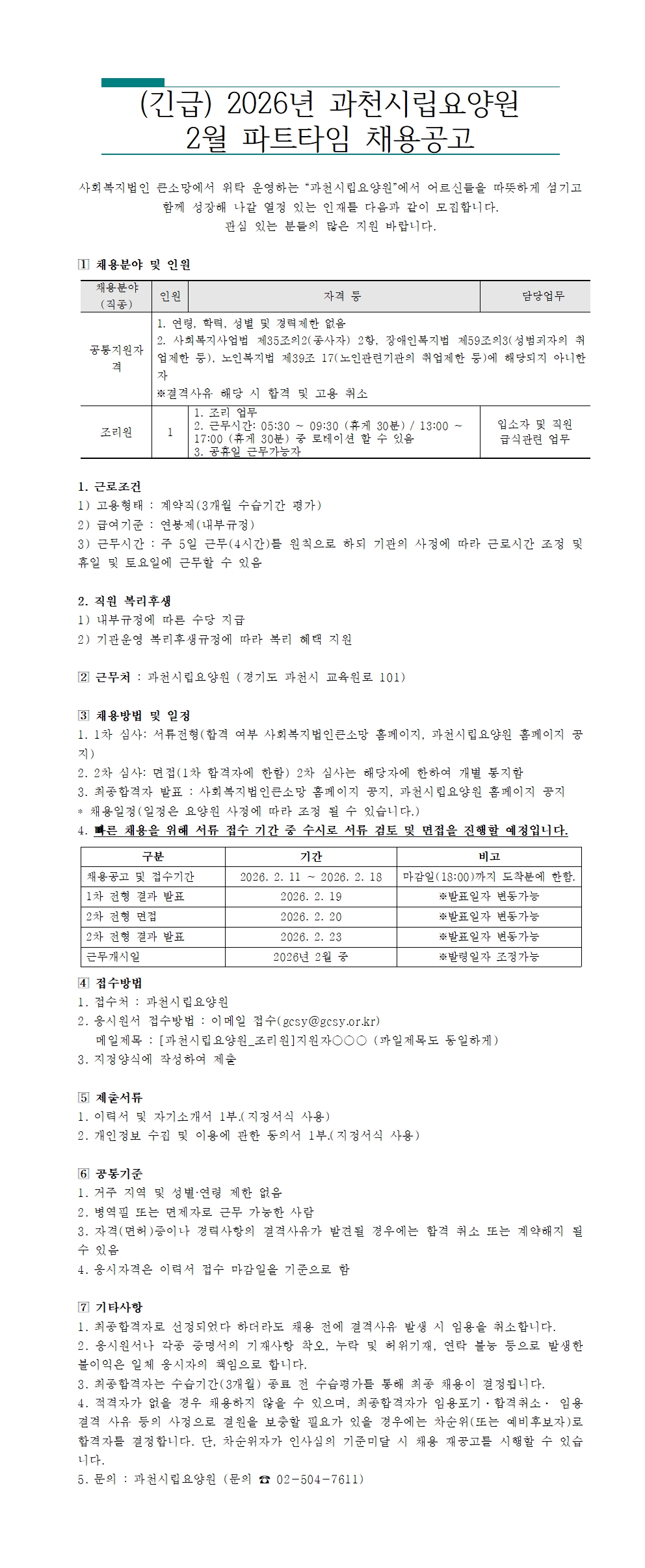 [ä¿ë-±ä±Þ] °úõ½Ã¸³¿ä¾ç¿ø Á¶¸®¿ø ÆÄƮŸÀÓ Ã¤¿ë °ø°í